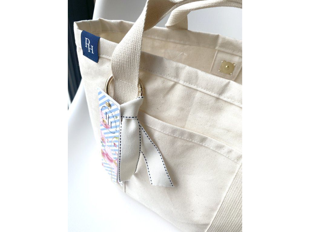 Součástí tašky je i kovový přívěšek ve zlaté barvě se stuhou.