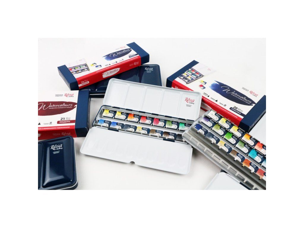 Umělecké akvarelové barvy Gallery od ukrajinského výrobce Rosa představují kvalitní barvu s vysokým obsahem pigmentu a ověřenou recepturou. Vyrábějí se na bázi přírodní arabské gumy, která je základem všech akvarelových barev. Vyvinutí těchto barev probíhalo (a do určité míry stále probíhá) ve spolupráci s výraznými umělci, díky čemuž se barvy řadí světově mezi špičku. Na svou výbornou kvalitu jsou navíc za velice dobrou cenu. Praktická kovová kazeta.